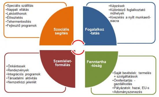 A szervezet fenntarthatósága több pilléren alapszik: szolgáltatások után állami bevételek és térítési díjak, pályázati források (évi átlag 30 projekt), saját bevételek generálása: farmgazdálkodás, turisztikai szolgáltatások, kézműves termékek előállítása, kiadáscsökkentés: energiahordozó gyártása, valamint adományszervezés.